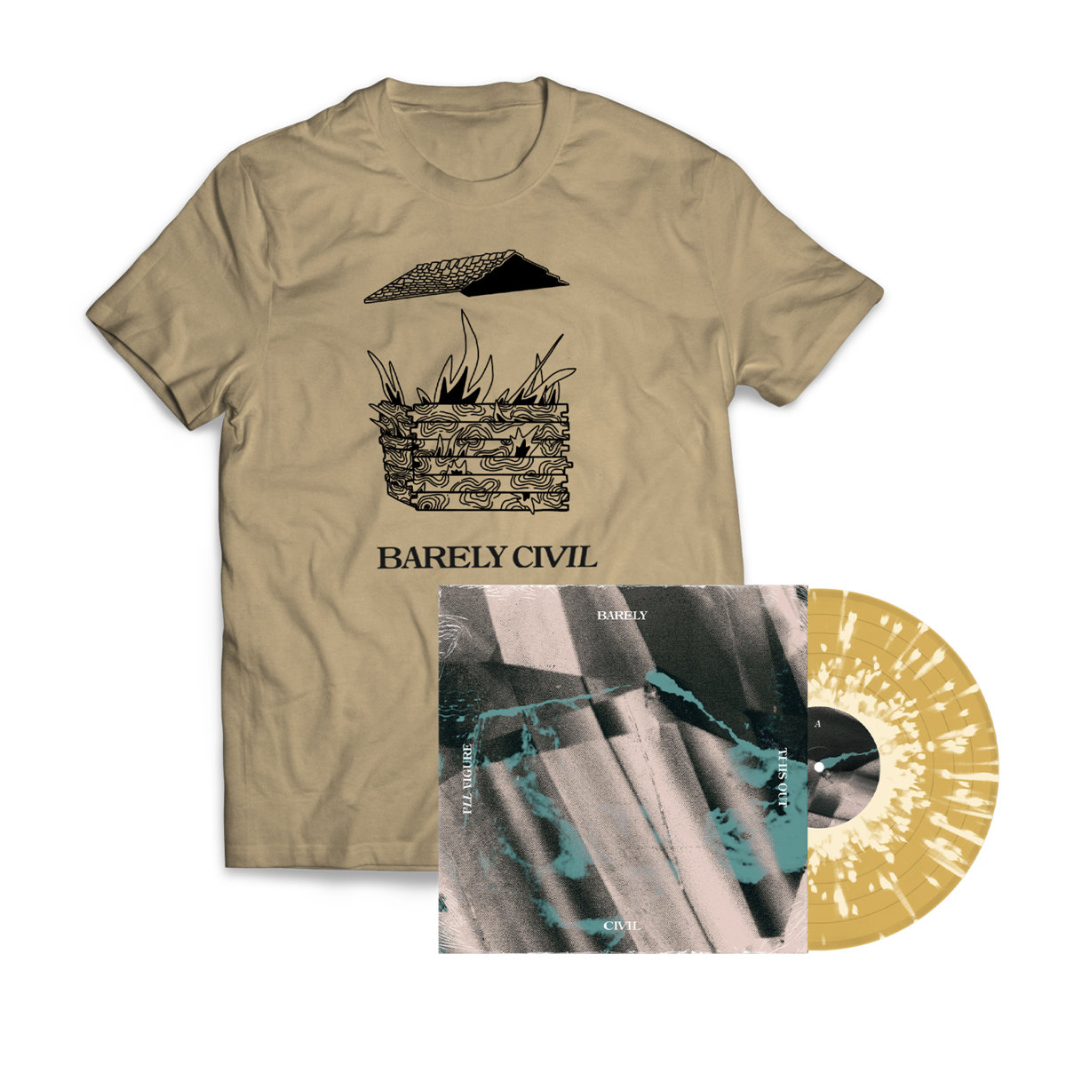 the shirt with the house that's on fire because barely civil's new album is so hot PLUS some beer flavored vinyl with some bone colored splatter
